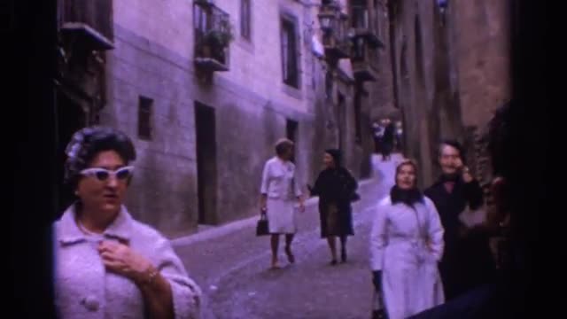 > 1966: townsfolk milling about down a narrow street in an ancient city SPAIN