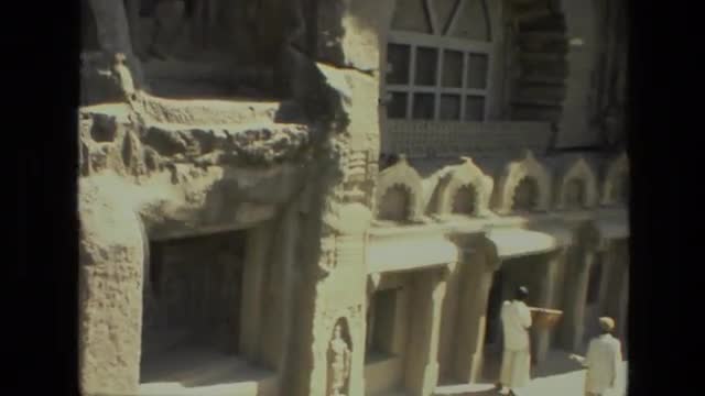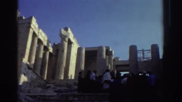 > 1976: people standing outside of ancient stone ruins atop a hill ISRAEL