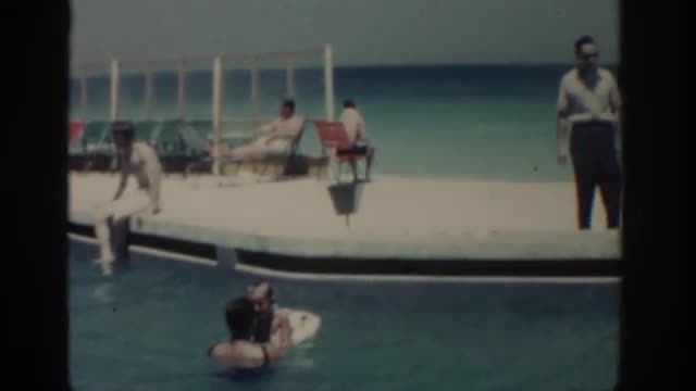 > 1962: a young boy with a floatation device around his waist jumps into the water and splashes around