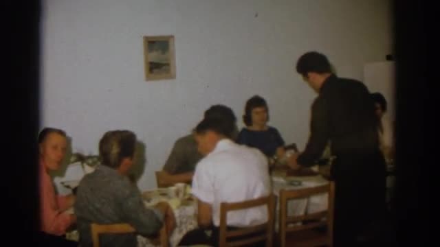 > 1963: happy family eating dinner while a man is serving ZURICH SWITZERLAND