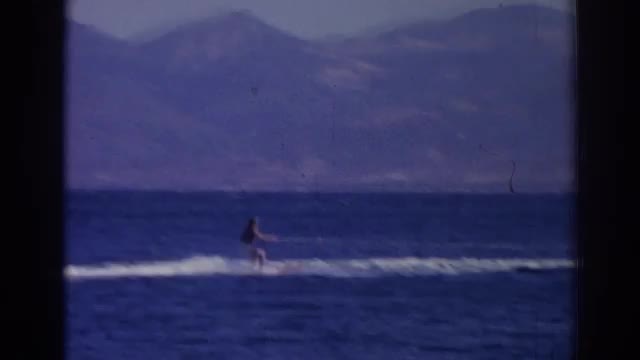 > 1962: a man water skiing behind a boat along a mountainous coastline IZMIR TURKEY