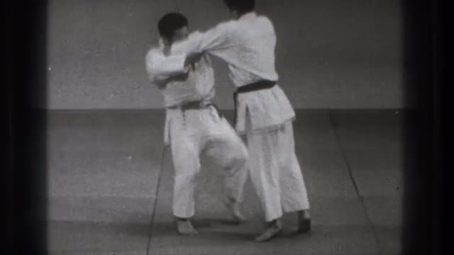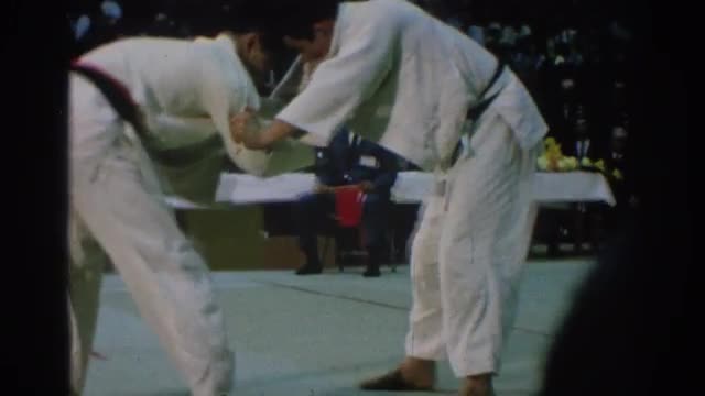 > 1966: two men competing in karate match as a crowd watches WEST COVINA CALIFORNIA