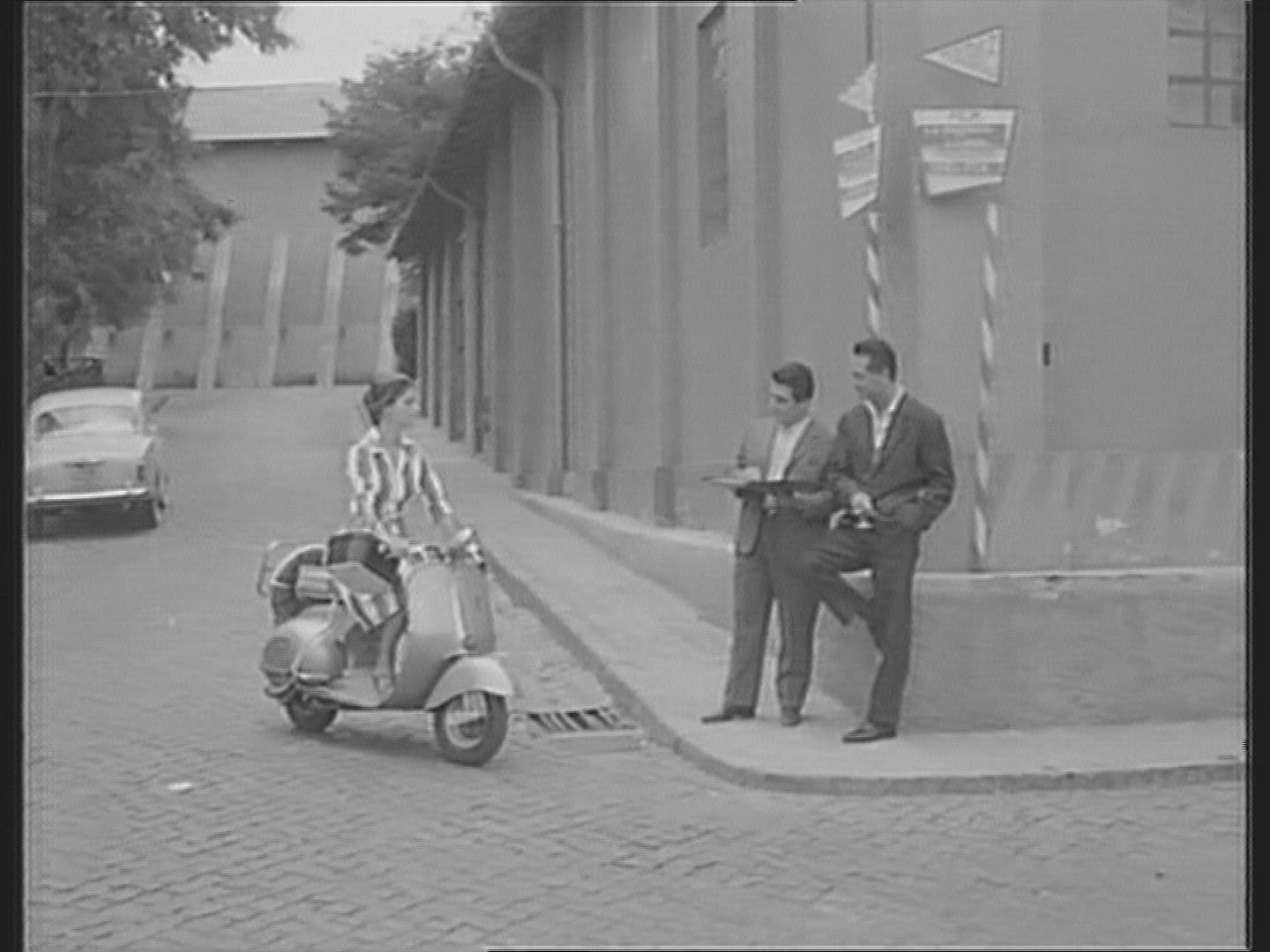 > 1937: a sign that reads truckee has a vehicle drive down the road past it, with horses at the end TR