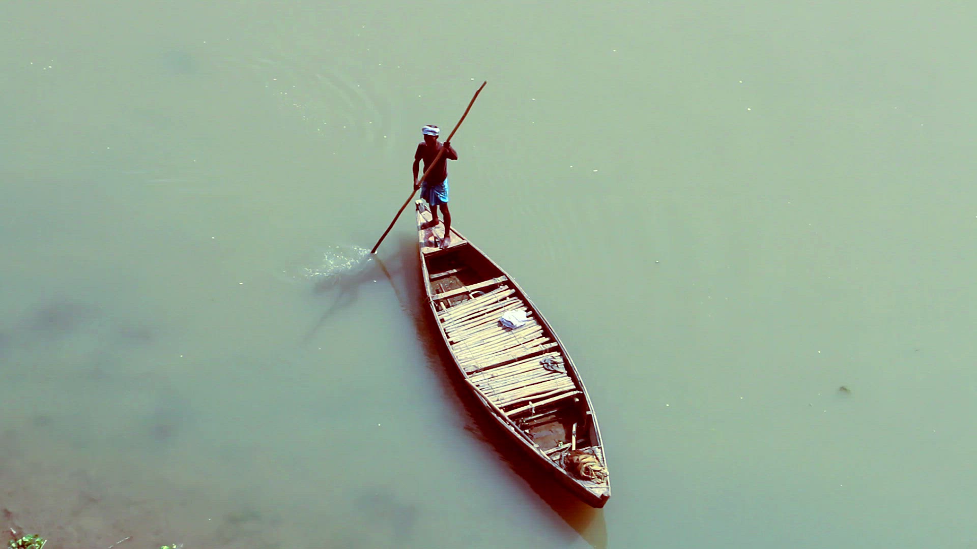 1938: an old man rowing his boat on a sunny day looks like he's enjoying the ride through the qu