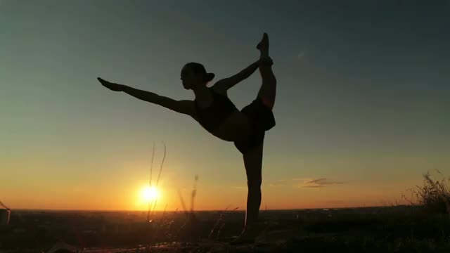 Silhouette of sporty woman practicing yoga in the park at sunset - lord of the dance pose. Sunset light, golden hour. Freedom, health and yoga concept
