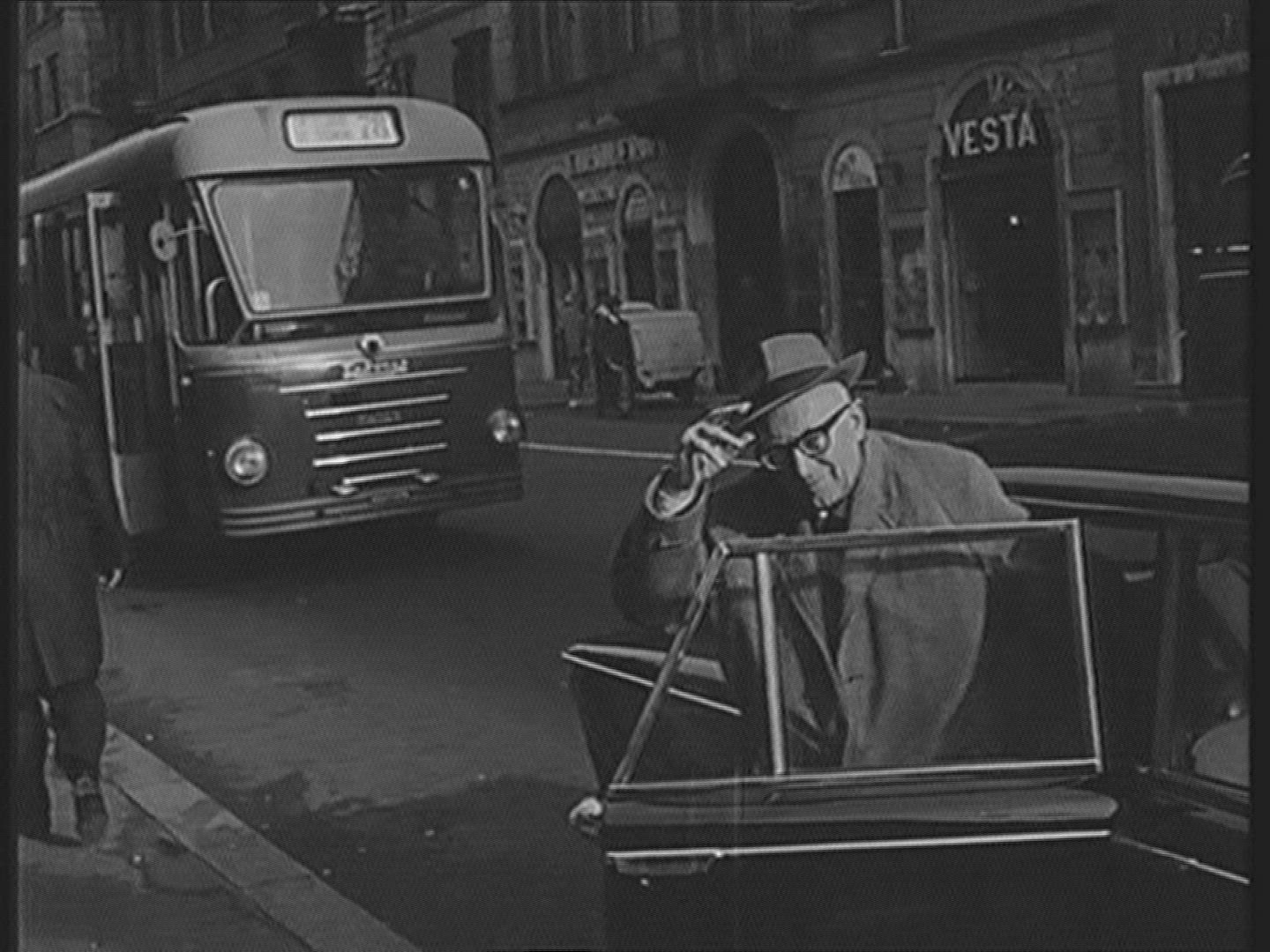 > 1958: an early motion picture showing an aged car, driving down a gravel road, past farmhouses and f