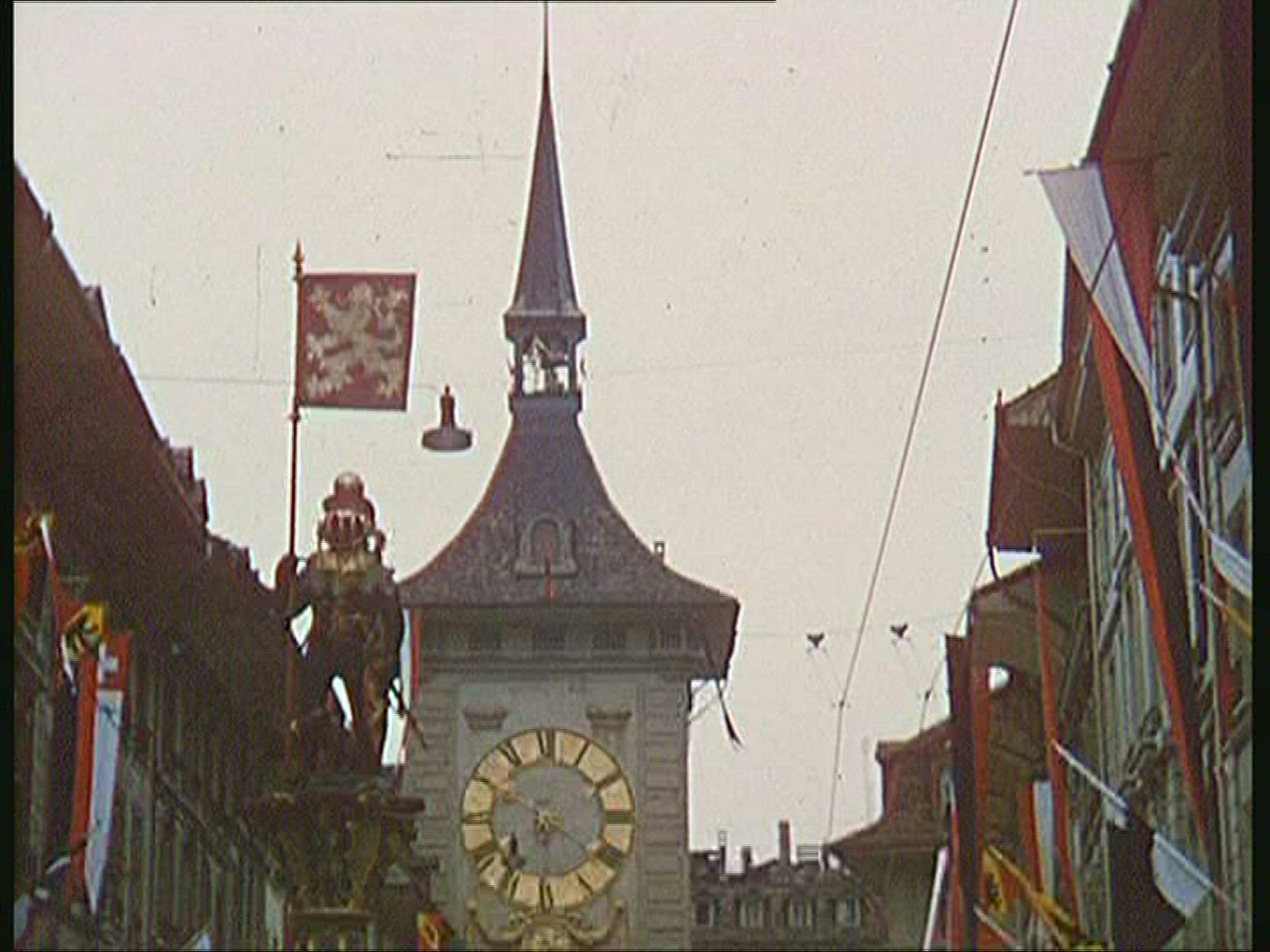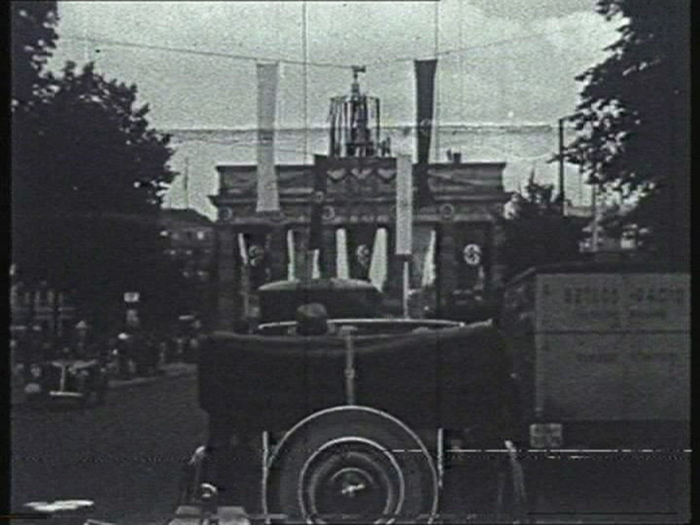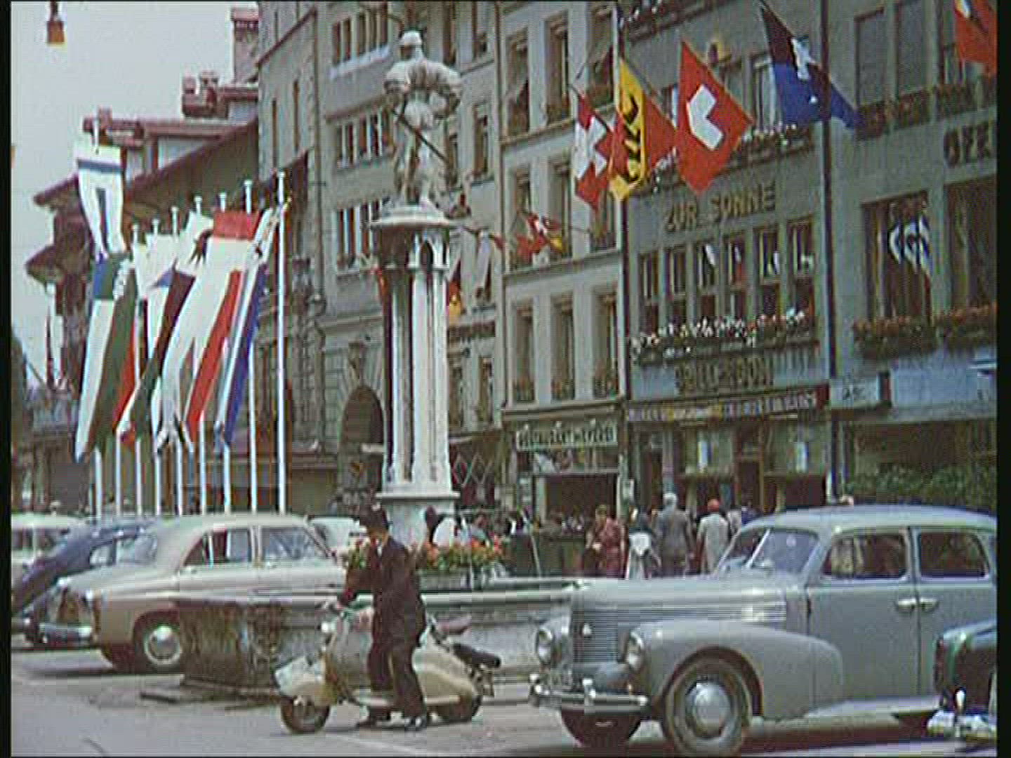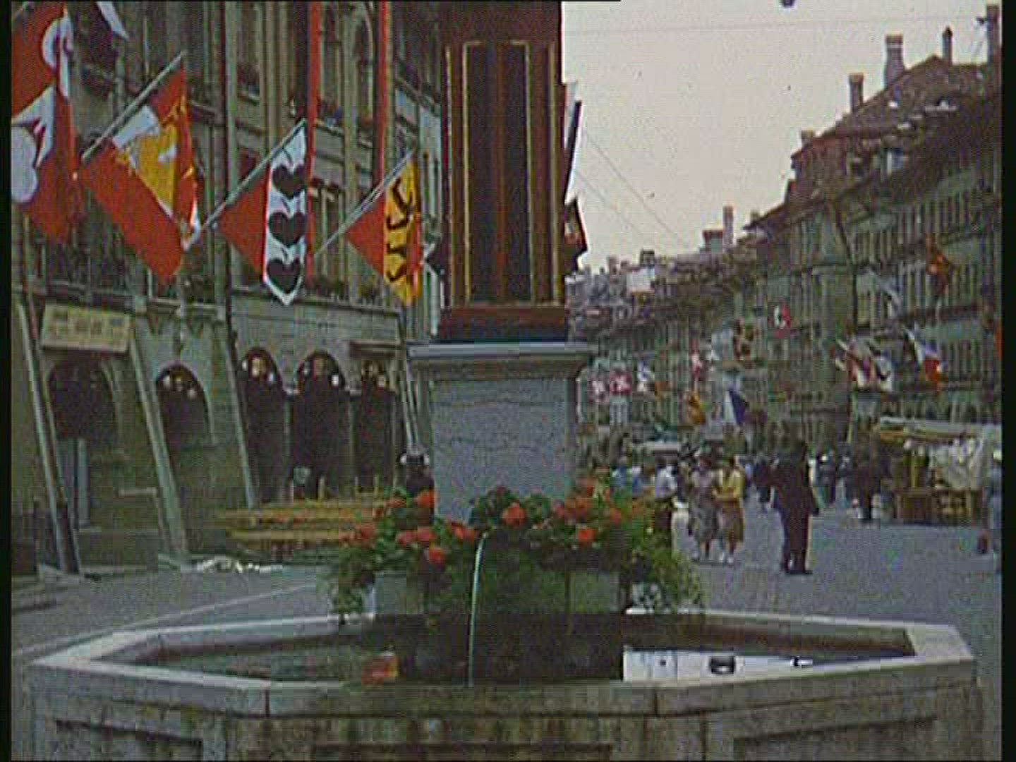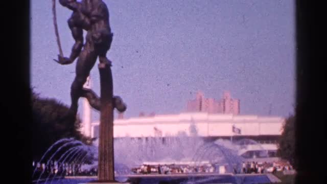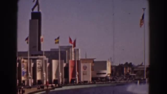 > 1939: city view with fountain many flags alongside NEW YORK WORLDS FAIR