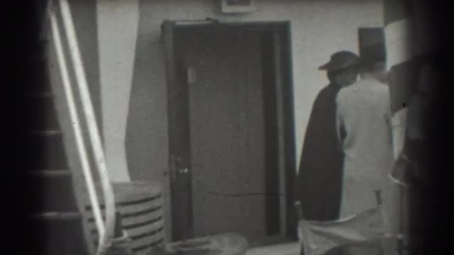 > 1939: woman turns and walks away from group that appears to be standing and waiting for an elevator