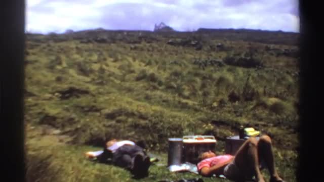 > 1976: group of tourist people enjoying the chill climate on a mountain top with good view of the nat