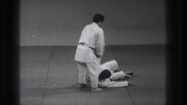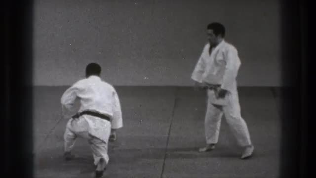 > 1971: two men wearing white are doing a karate move on each other on the floor. TOKYO JAPAN