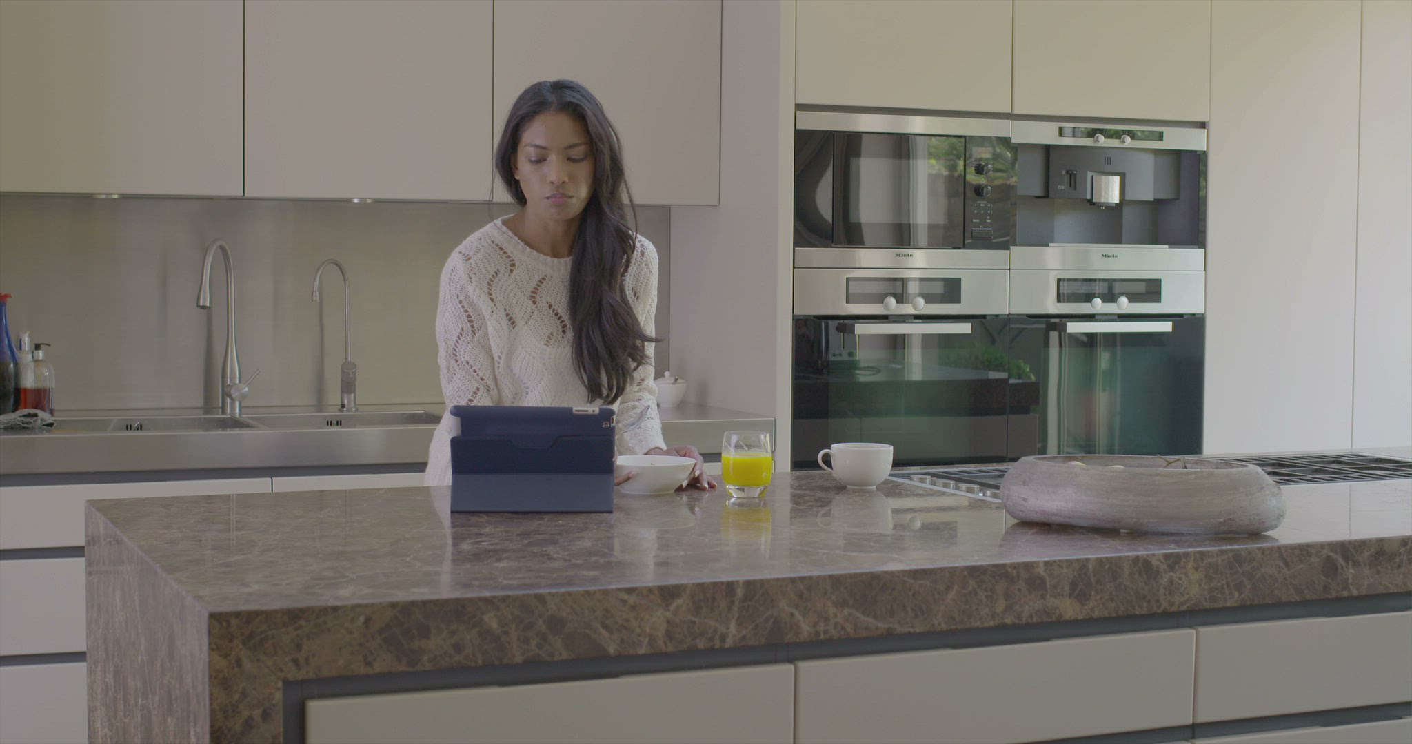 Business Woman Checks Statements. She Drinks Tea and Checks the Message on the Phone. on the Table is a Tablet and a Notebook.