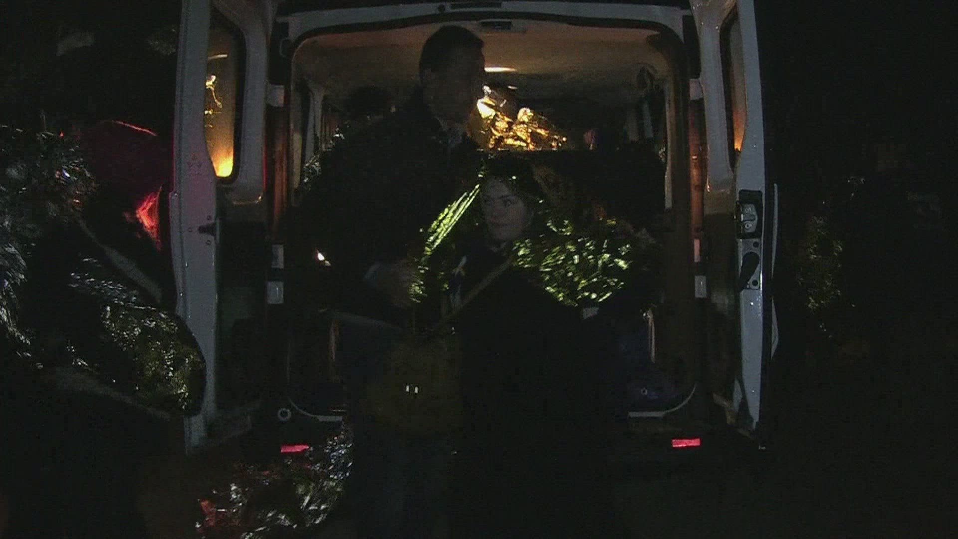> 1957: full boat of children and man going down a river passing by a woman in a bright blue dress FLO