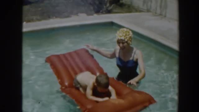> 1961: a kid on an inflatable raft at the swimming pool NORTH HOLLYWOOD, CALIFORNIA