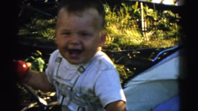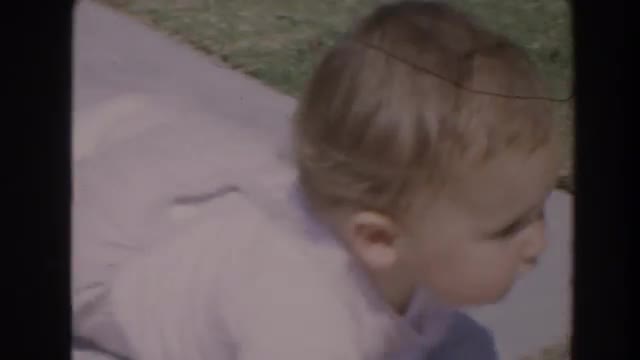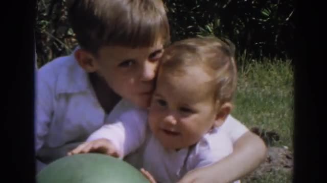 > 1964: a brother playing ball with a baby in the grass NORTH HOLLYWOOD, CALIFORNIA