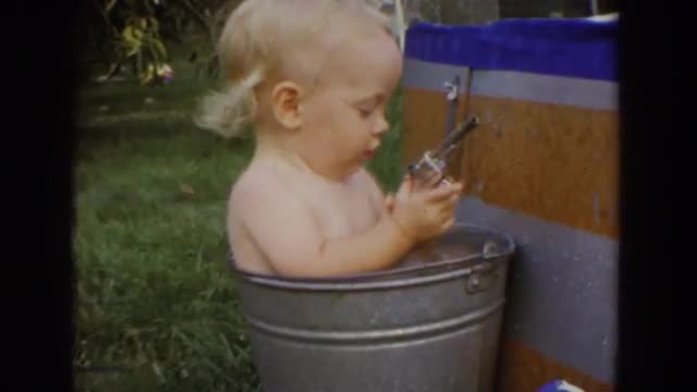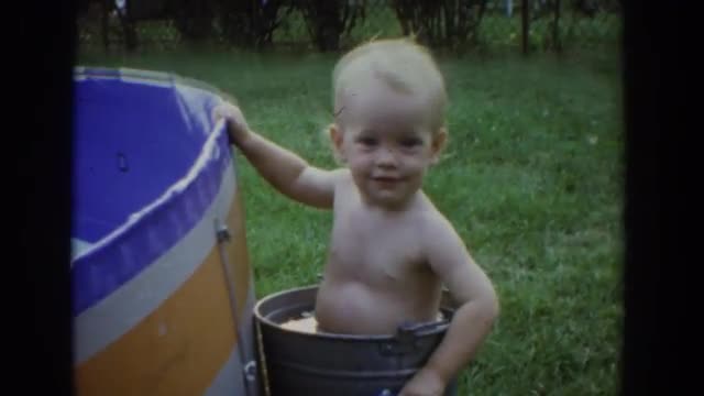 > 1962: a baby boy swimming in a swing in a yard GLENDALE, CALIFORNIA