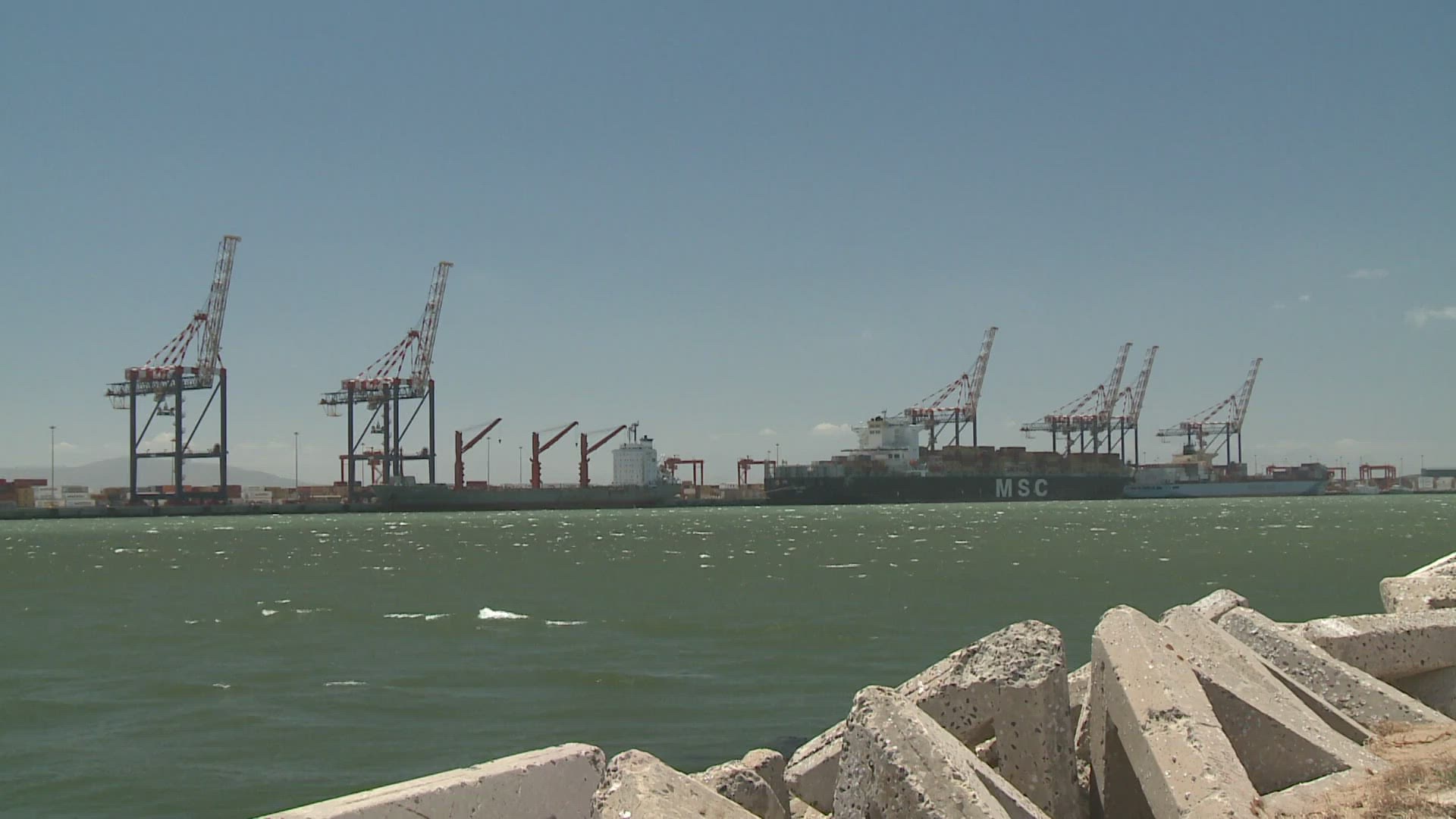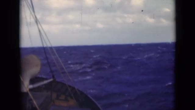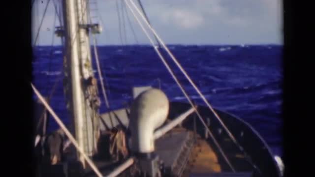 1959: merchant ship sailing through choppy seas.