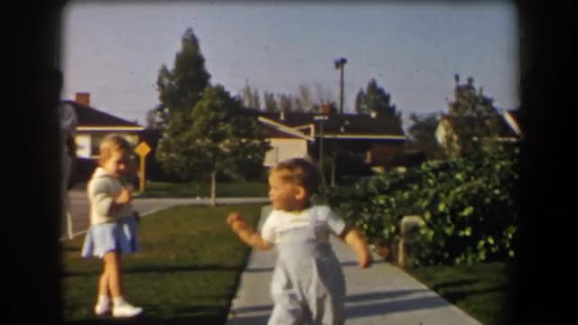 > 1958: a cute little boy in overalls running down the sidewalk from his family CALIFORNIA