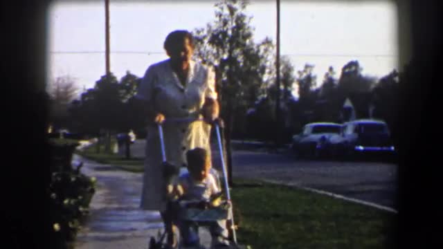 > 1958: an older lady pushing a baby in a carriage CALIFORNIA