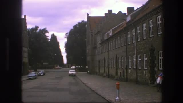 > 1975: panning shot of an urban town with a person walking with his/her bicycle. COPENHAGEN