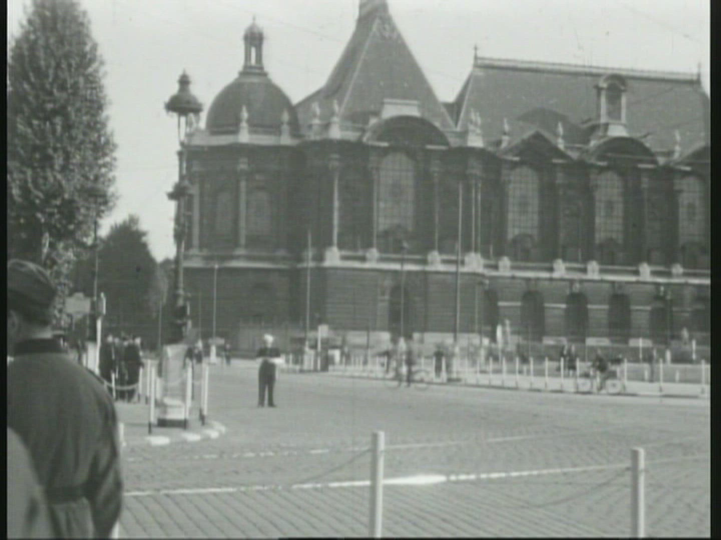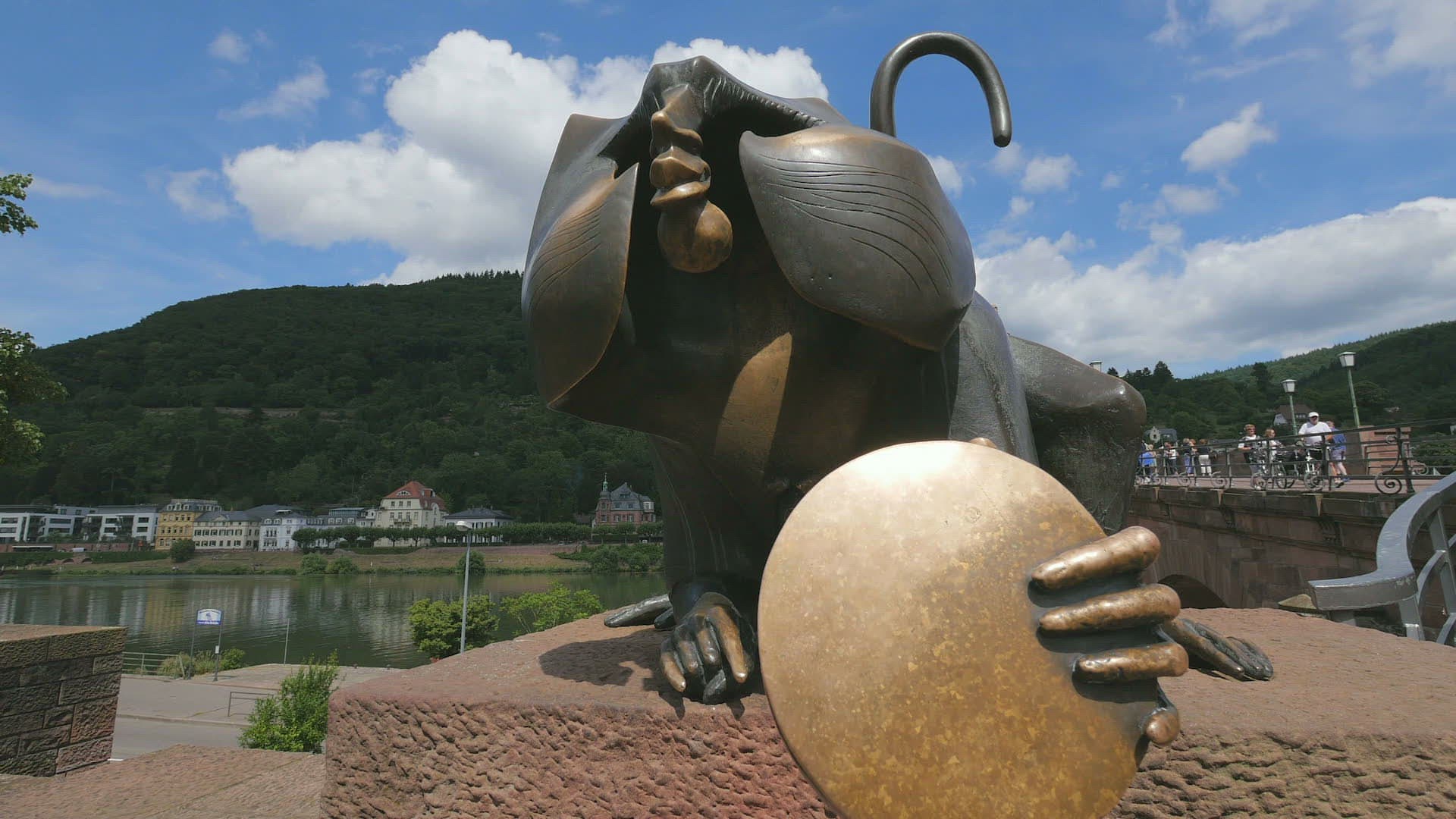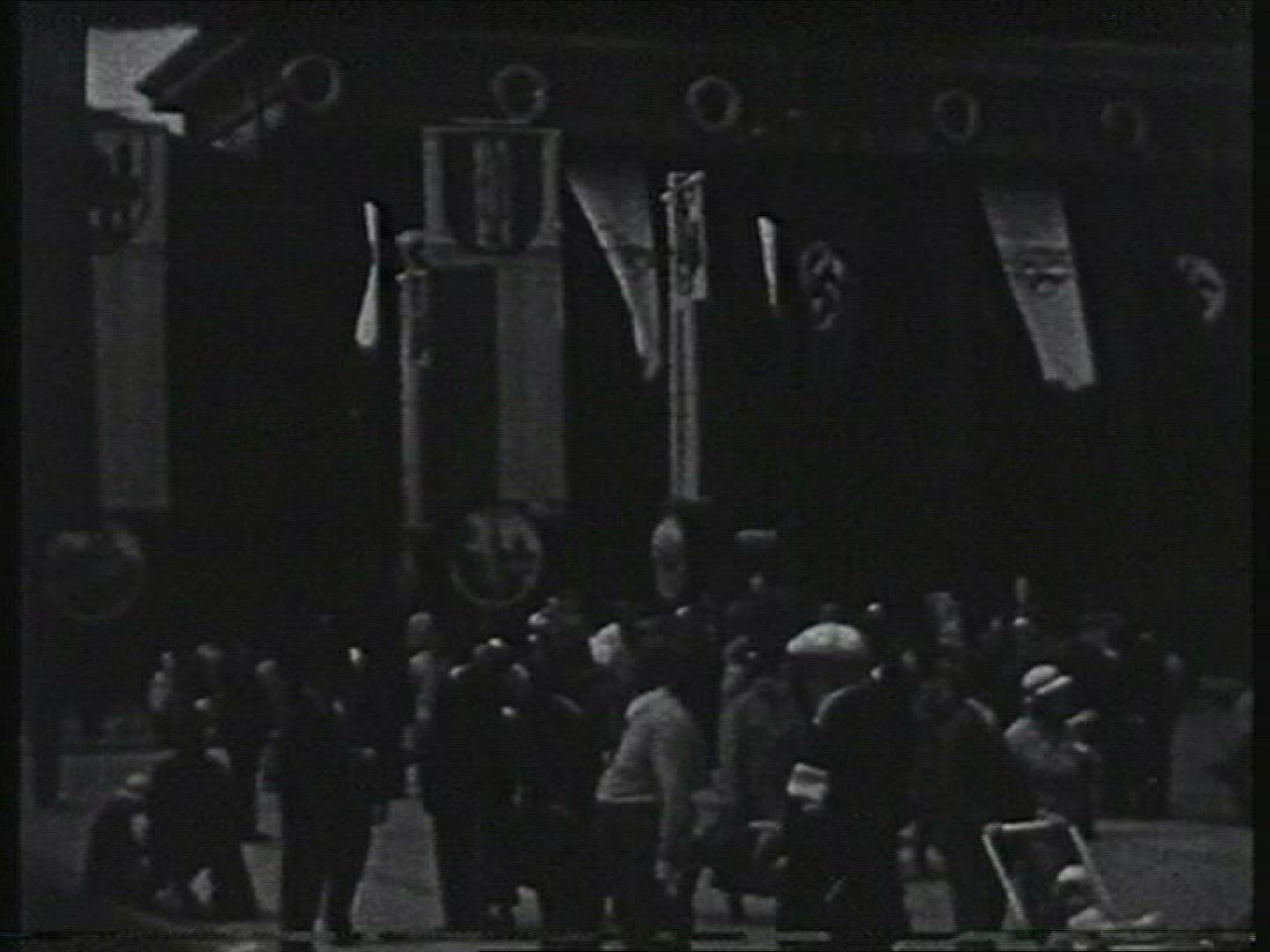 > 1960: people walking in opposite directions before a sculpture depicting a man carrying the world NE