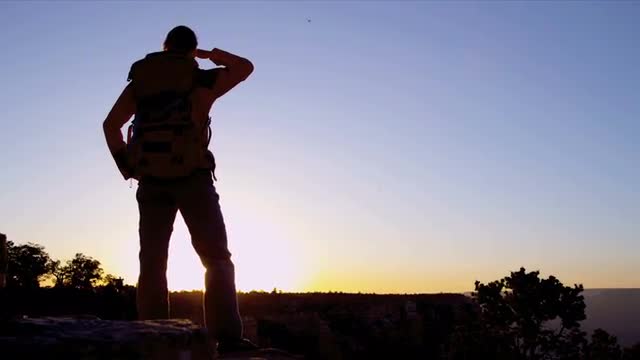 Lone female hiker watching the sun setting over the canyons, USA, Shot on Red Epic