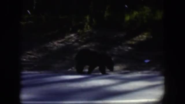1951: a large black bear sniffs the ground as it walks down the road WYOMING