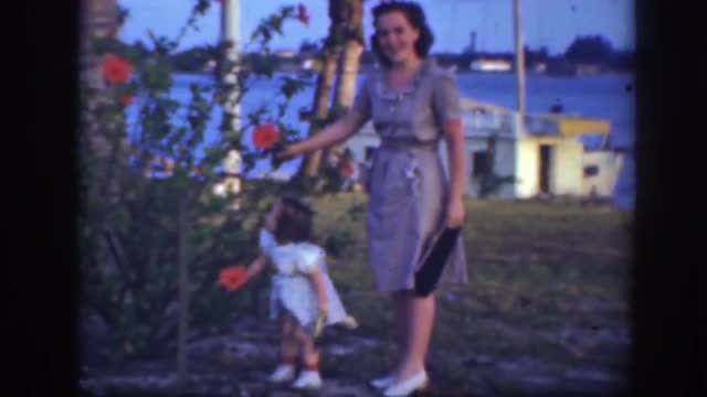 > 1945: people outside standing near a tree with blooms smiling and laughing FLORIDA