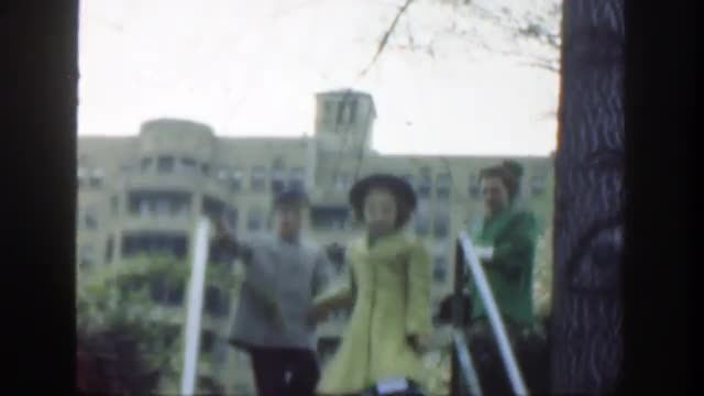 > 1949: sister guiding brother down city steps while mother laughs. CINCINNATI OHIO