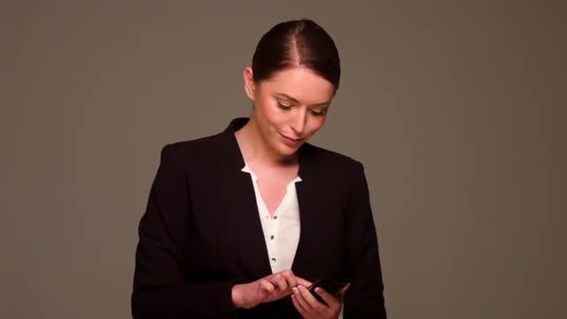 Woman using app on smartphone smiling and texting on mobile phone. Beautiful multicultural young casual female professional on mobile phone. Mixed race Caucasian Caucasian model.