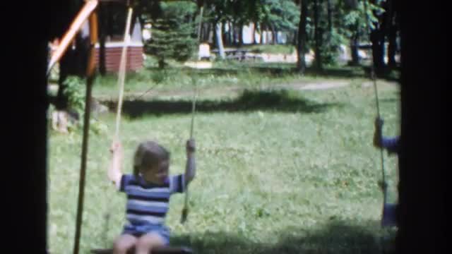 > 1953: a little boy and girl outside swinging on a swing set in the yard WISCONSIN