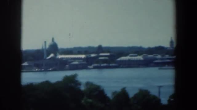 > 1957: panning of a body of water to show vegetation and buildings WISCONSIN