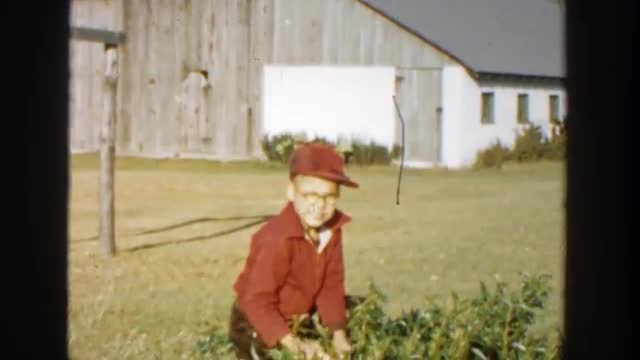 1958: child in a hat outside using a tool to remove some branches of a plant MICHIGAN