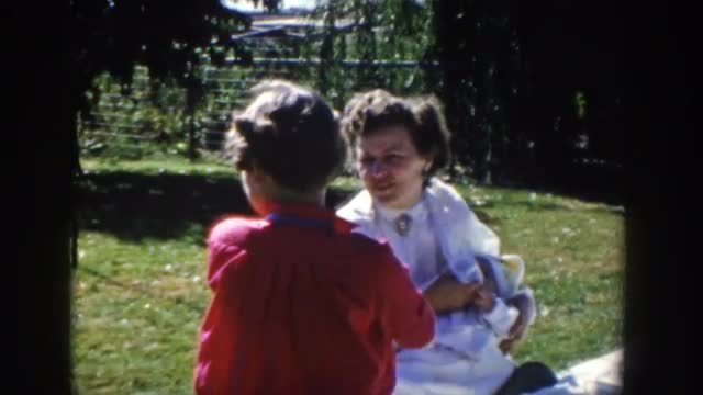 > 1958: mom feeding infant while visiting the park with her daughter. WISCONSIN