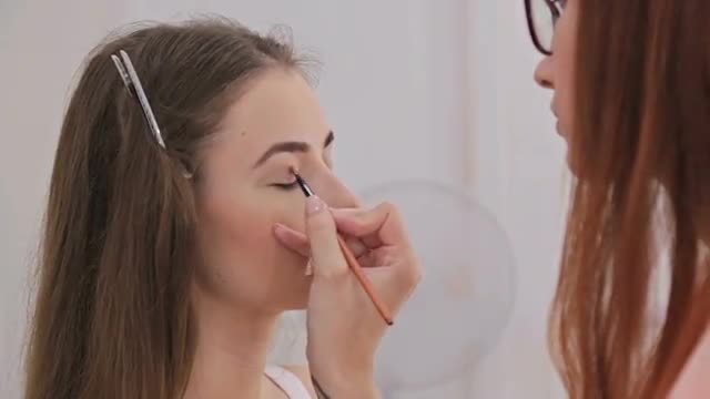 750037 - 2 shots. Professional make-up artist applying cream base eyeshadow primer to model eye