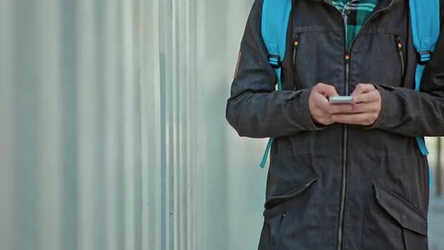 Close Up on Male Hands Swipes on Phone He is Standing Against the Glass of the House Outdoors on Cold Day