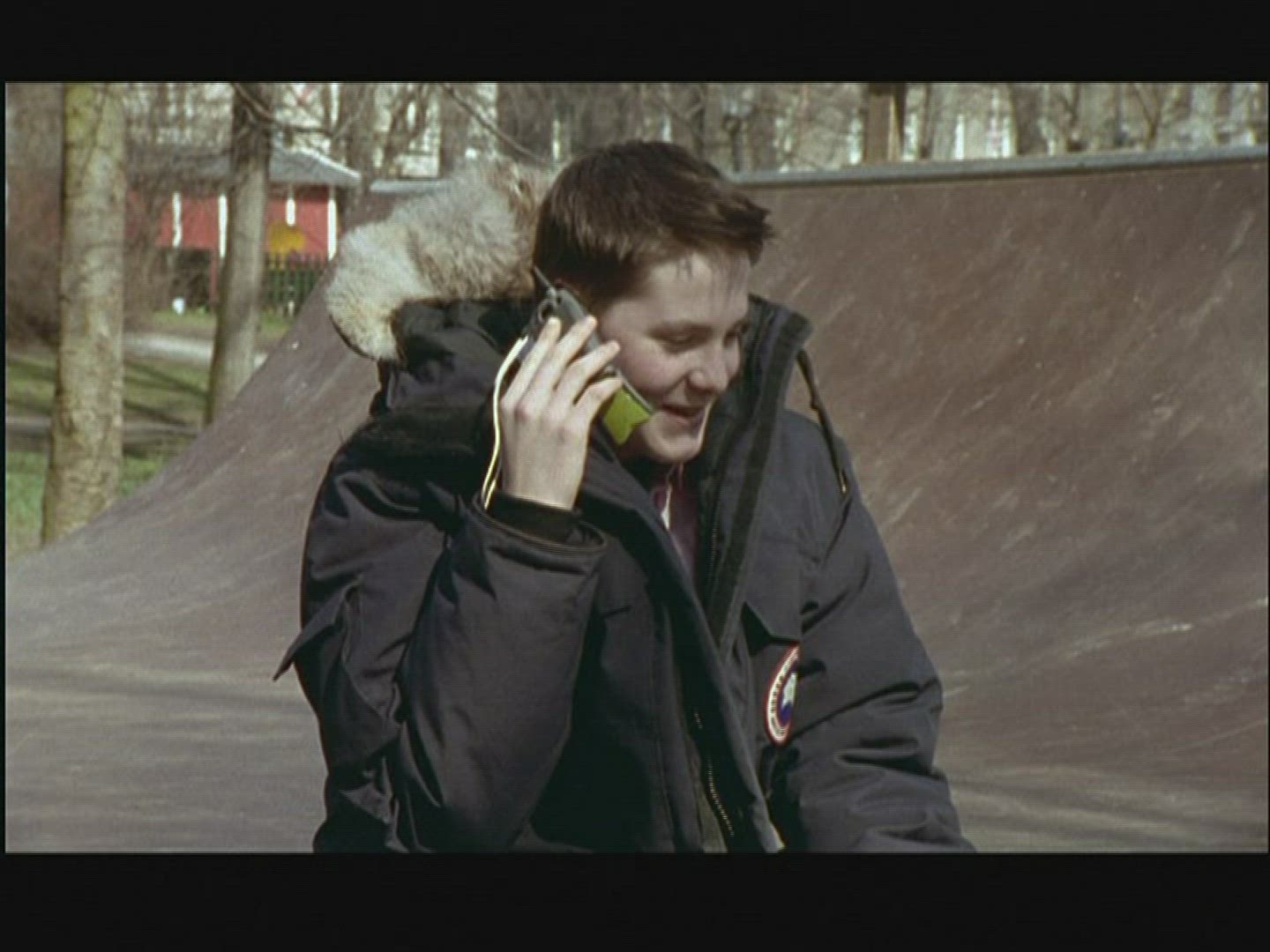 Outdoors winter shot of a young brunette girl talking by phone