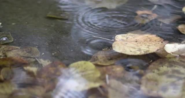 Rain Drops Falling at the Puddle With Autumn Leaves