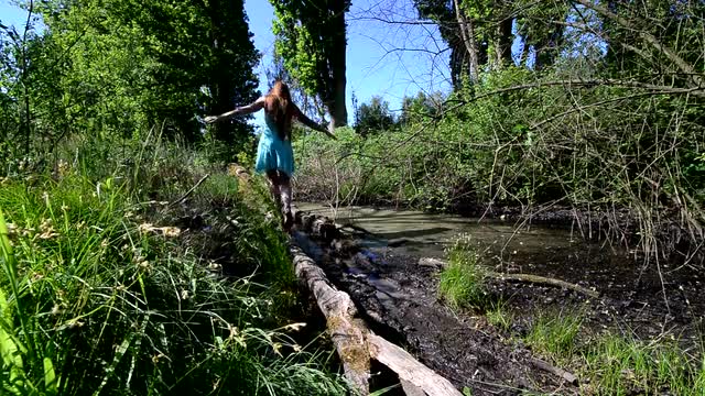 a Little Girl Contorts Funny Faces to Parents. She Stands on a Small Wooden Platform Which is Attached to a Tree. the Girl is in a Amusement Park. This Video Was Recorded on Camera With Help of a Slow-Motion Mode.