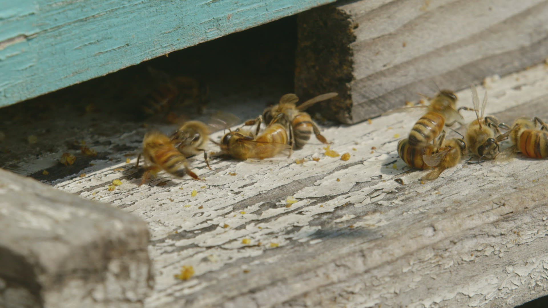 Hylaeus bee approaches mint flowers near large wasp, medium high speed shot.