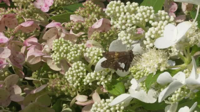 662739 - Moth feeding on white hydrangea flowers, medium shot