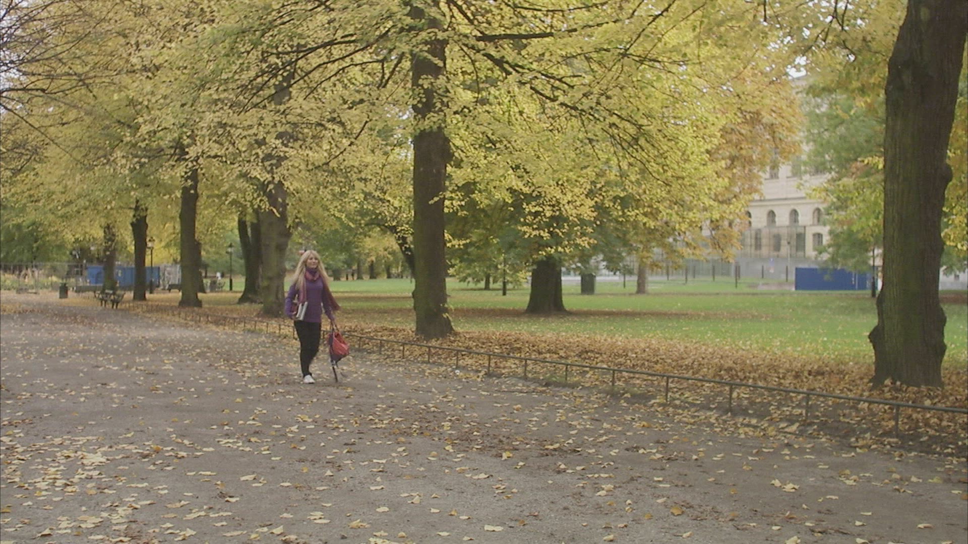 Rain Drops Falling Over Yellow Leaves Close up View With Blurred Man Pushing His Bicycle