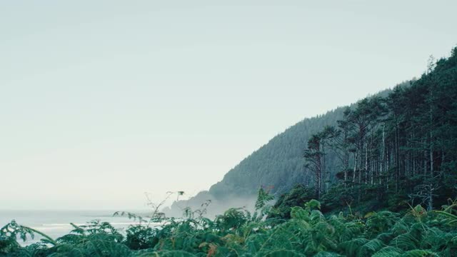 > Oregon Coast beach sunset in Summer. Where the forest meets the ocean in slow-motion