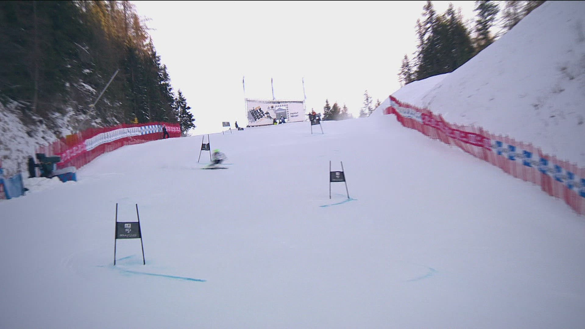 > 1961: a man is skiing down a mountain slope, doing a slalom from right to left down a steep hill ASP