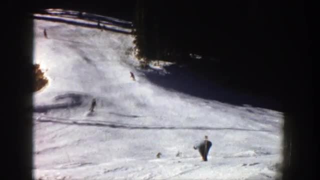 > 1961: people one by one going down a skiing hill ASPEN COLORADO
