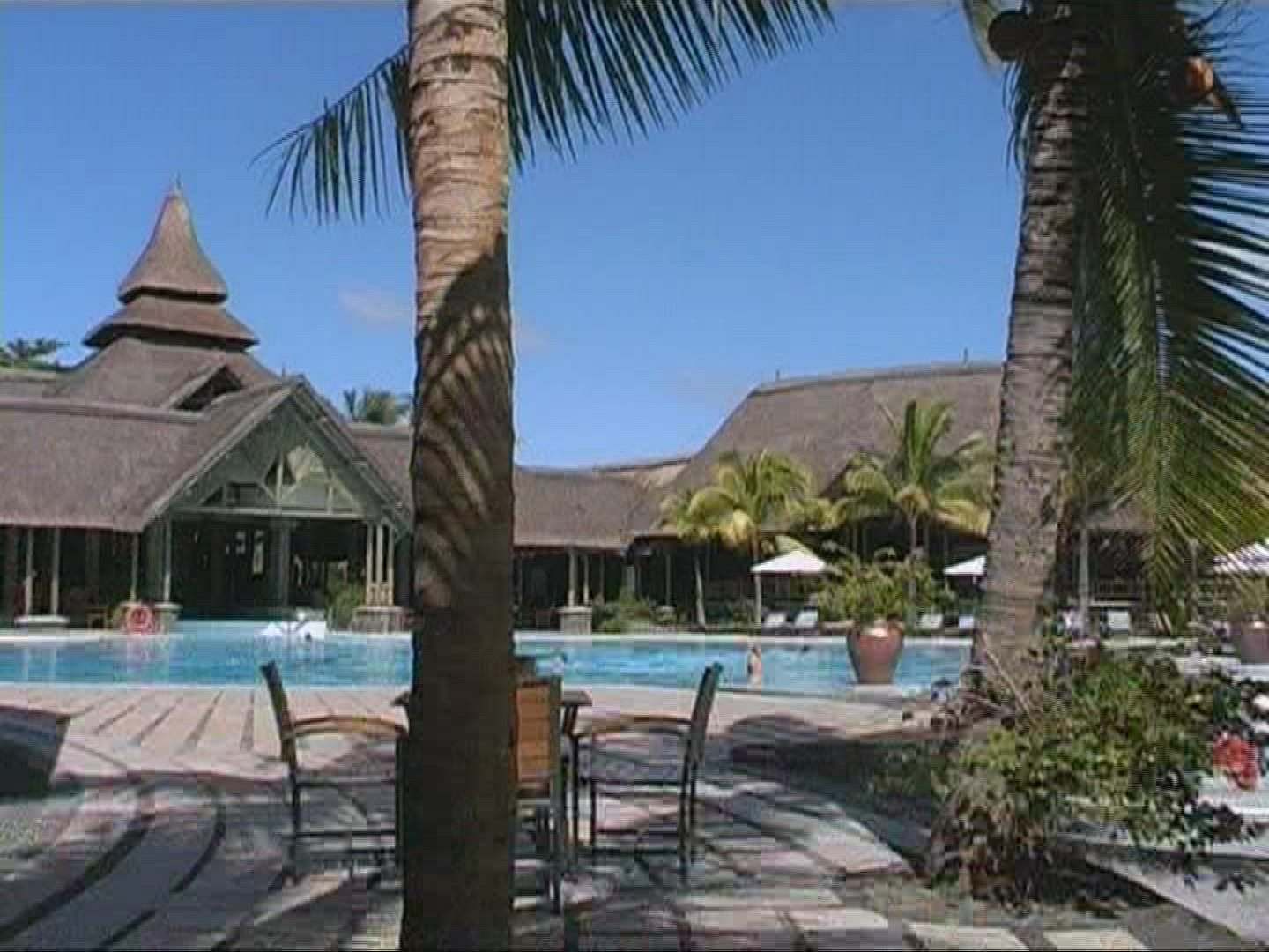 > 1961: hotel complex with terraces stands behind palm trees and resort area and hotel named HAWAII