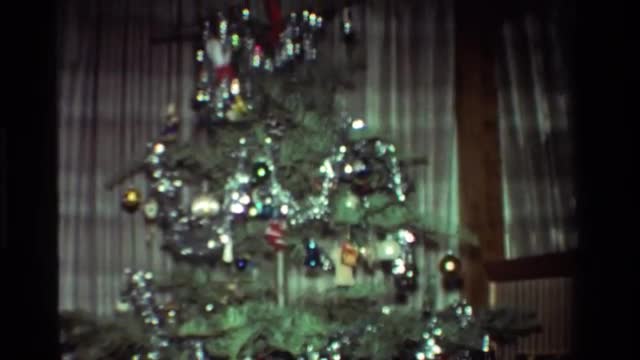 1955: christmas tree loaded with tinsel in a living room with many presents around it NEBRASKA