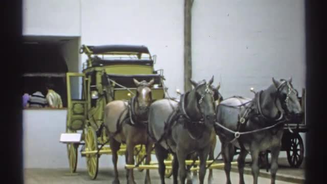 > 1952: a cart drawn by four horses transports a group of people in a rural area CALIFORNIA