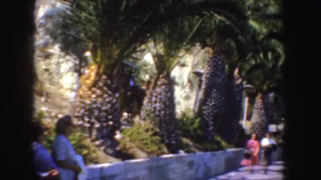 > 1952: horses and carriages wit people drive past palm trees next to women walking on the pavement CA