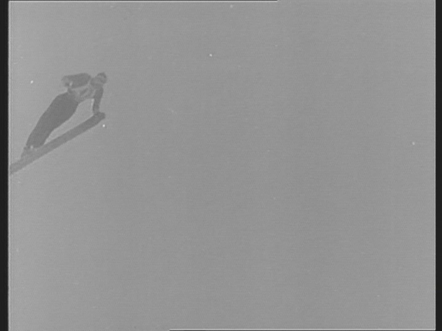 > 1962: crowd observing ski jumper approach, jump, and accelerate before stopping at the bottom of the