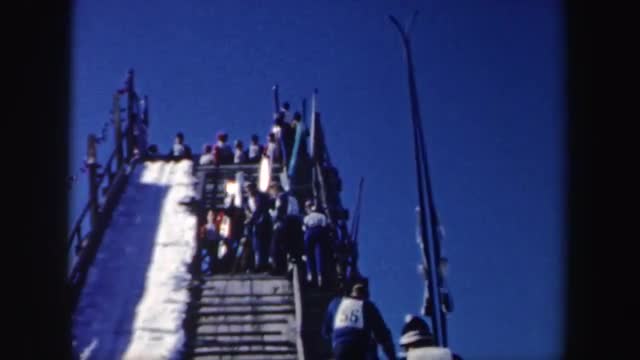 > 1962: skiers mounting the slope to get ready for a competition NEW YORK